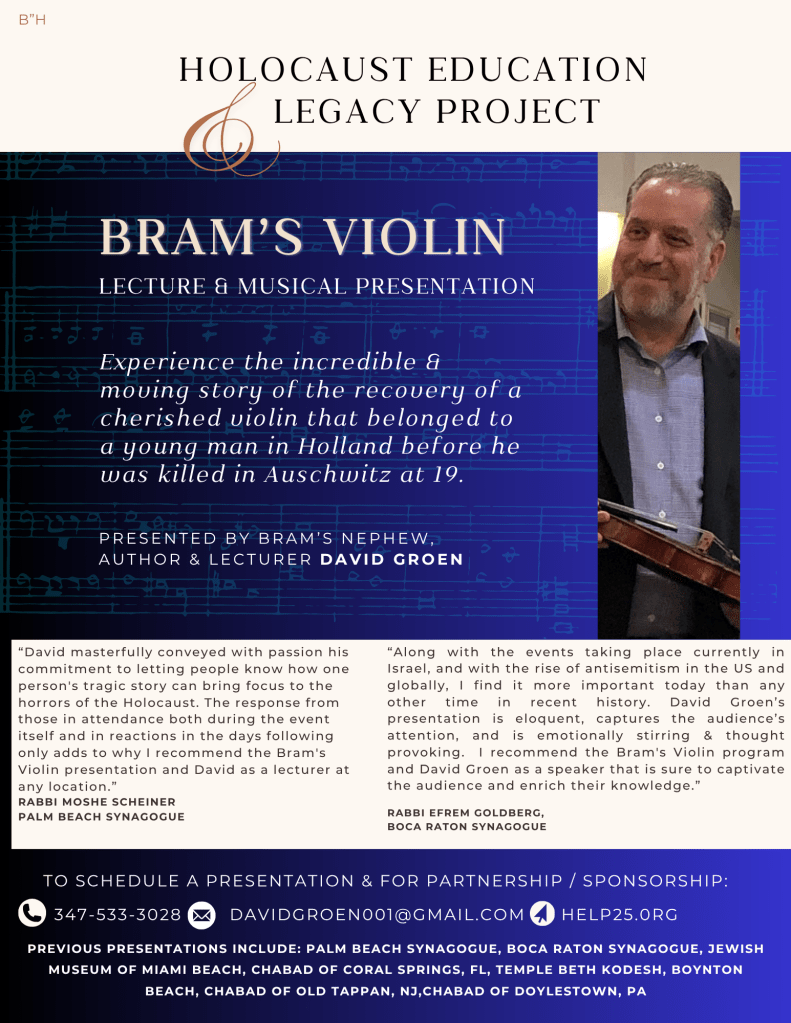 Through the Holocaust Education & Legacy Project, Author and Presenter David Groen transforms personal tragedy into a mission: to honor his Uncle Bram, to tell the truth about the Holocaust, and to fight rising antisemitism and hate wherever it appears.